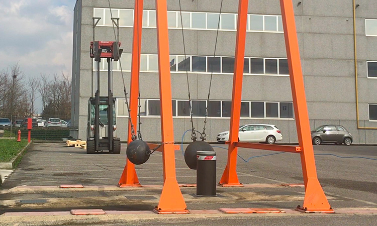 Il pendolo gravitazionale viene utilizzato per eseguire i test d’urto sui prodotti Pilomat. È costituito da una struttura dotata di un “martello” di coniatura sferica indeformabile, che viene lasciato cadere senza velocità iniziale lungo un piano verticale. Il martello è fissato a un asse di rotazione regolabile, così da impostare con precisione l’altezza d’impatto desiderata. I prodotti da testare vengono posizionati nell’area test in modo che il punto d’impatto coincida con il punto in cui la traiettoria del martello incontra il piano verticale. Il sistema consente di variare l’energia di impatto da 500 a 100.000 Joule, in funzione della massa del martello e dell’altezza di caduta. Questa tecnologia permette di determinare i limiti di rottura e migliorare quindi l’affidabilità delle nostre soluzioni a seguito di urti da veicoli.